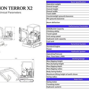 - The TYPHON TERROR X2 STORM mini excavator machine comes complete with 1 x standard digging excavator bucket, 1 x tool box, 1 x canopy, and 1 x digital manual with all the necessary instructions.